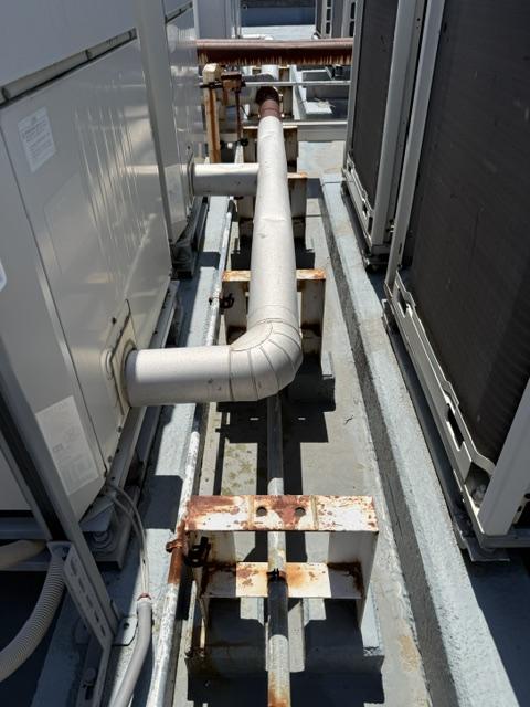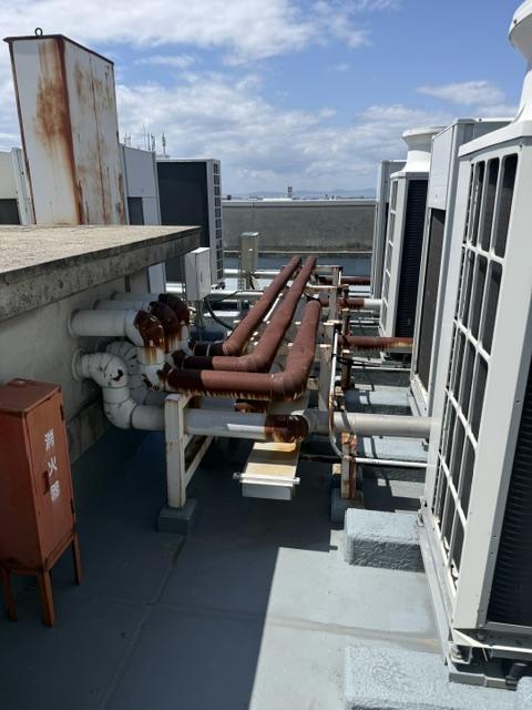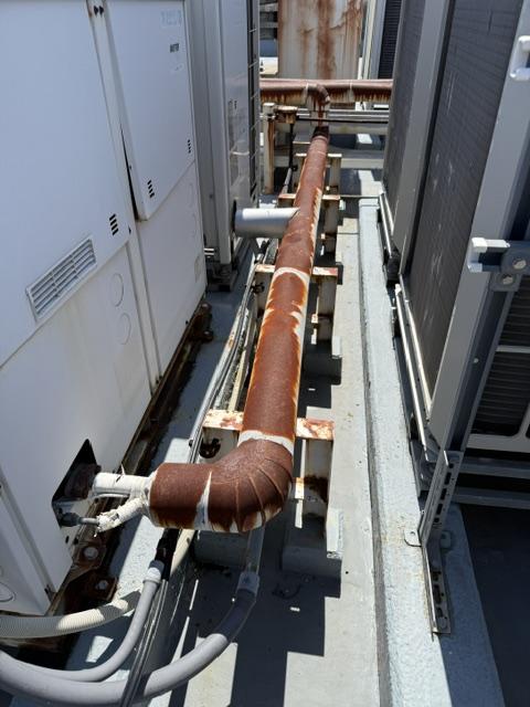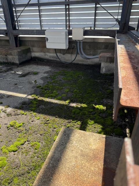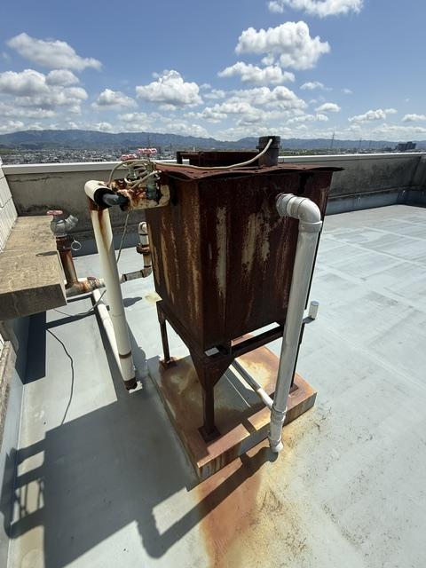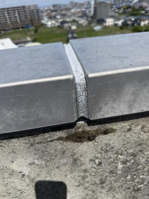 屋上怪しい部分パラペット笠木もシール劣化で割れて所も全て打ち替えします。完全な防水工事が始まる時には、鉄部や配管などもサビが酷いので、先行で鉄部関連の塗装を仕上げてから防水にかかるようにします。エレベーターシャフトの屋上付近も間違いなく防水工事を行います。